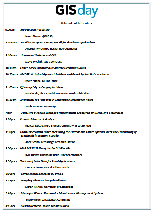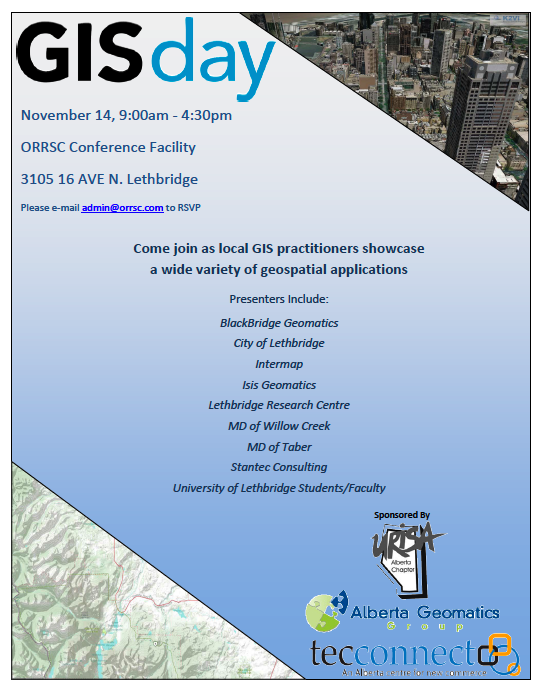 In Lethbridge, AB the Oldman River Regional Services Commission (ORRSC) hosted a GIS Day event on November 14th. It was an all day event that featured 11 different presentations, all of which discussed different applications of where GIS science is used. 4 Presentations were from private industry, 3 were municipally based, one from a federal government department, two from University of Lethbridge students, and another one from a faculty member from the University of Lethbridge. There were 50 people that attended the event, representing 23 different organizations. Sponsorship of the event was provided by tecconnect, URISA, and the Alberta Geomatics Group. It was a fantastic networking opportunity for all in attendance as nearly every geospatial user in Southern Alberta attended the event.