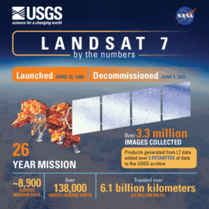 On June 4, 2025, Landsat 7 was officially decommissioned, closing out a mission that spanned more than two decades. Launched in 1999, Landsat 7 carried the Enhanced Thematic Mapper Plus (ETM+), adding new capabilities to an already groundbreaking Earth Observation program. Although its nominal science mission ended in 2022, the satellite continued to deliver valuable imagery until January 2024.