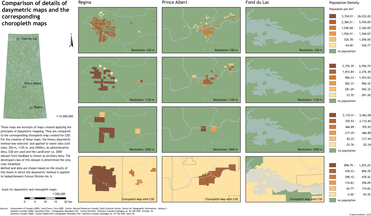 Anne: Currently I am working on my MSc thesis about the “Cartographic Visualization of Saskatchewan’s Population using Dasymetric Mapping”. For my thesis I am applying different dasymetric techniques using GIS. Doing this, I am improving the quality of population maps visually and quantitatively when compared to the traditionally applied choropleth method.