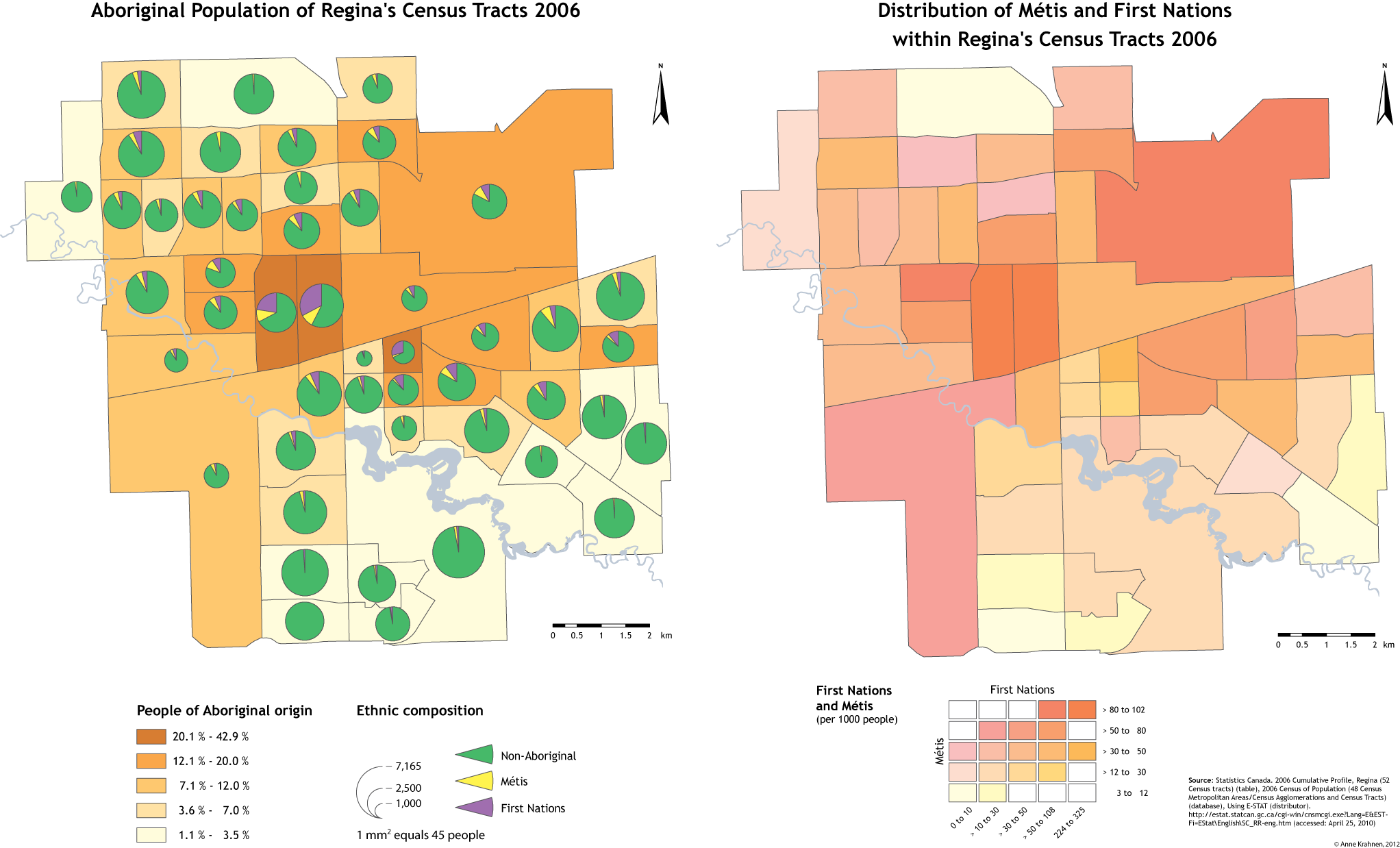 Anne: The first two maps were created for an assignment in a population geography class. I examined racial segregation (regarding Aboriginal population) in Regina, Saskatchewan and used the two maps to explain and support the results of my study. The map on the left hand side shows census tracts with high percentage and lower percentage of Aboriginal population within the city. This map also shows non-Aboriginal, Métis and Aboriginal population in absolute numbers. The map on the right hand side compares directly the ratio of Métis and First Nations population. A two-dimension colour scheme was chosen to directly compare the numbers: Generally it can be said that the darker the color, the more aboriginal population is located in one Census Tract. Yellow colours indicate higher percentage of First Nations population and pink colours show a higher percentage of Métis population.