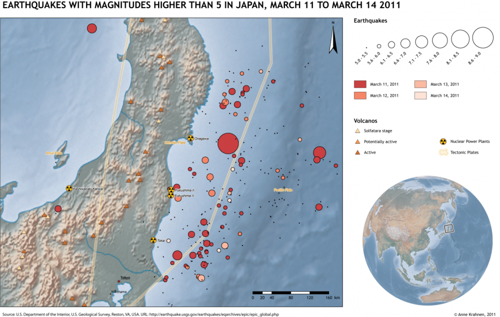 The second map was created after the 2011 earthquake and tsunami in Japan. It was intended to show the extent of earthquakes just four days after the disastrous earthquake:
