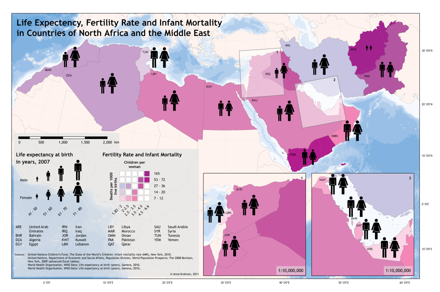 The map showing life expectancy at birth, fertility rates and infant mortality rates in parts of Nothern Africa and the Middle East, is part of a map series on this region of the world. Life Expectancy is shown for both, men and women. Infant mortality rate and fertility rates are visualized with a bi-polar color scheme, which gives even more information since these variables are closely related: