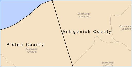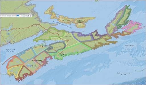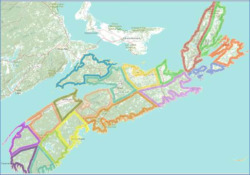 Figure 2: Thick (5 km) borders around inside of each NS County (ArcGIS Online)