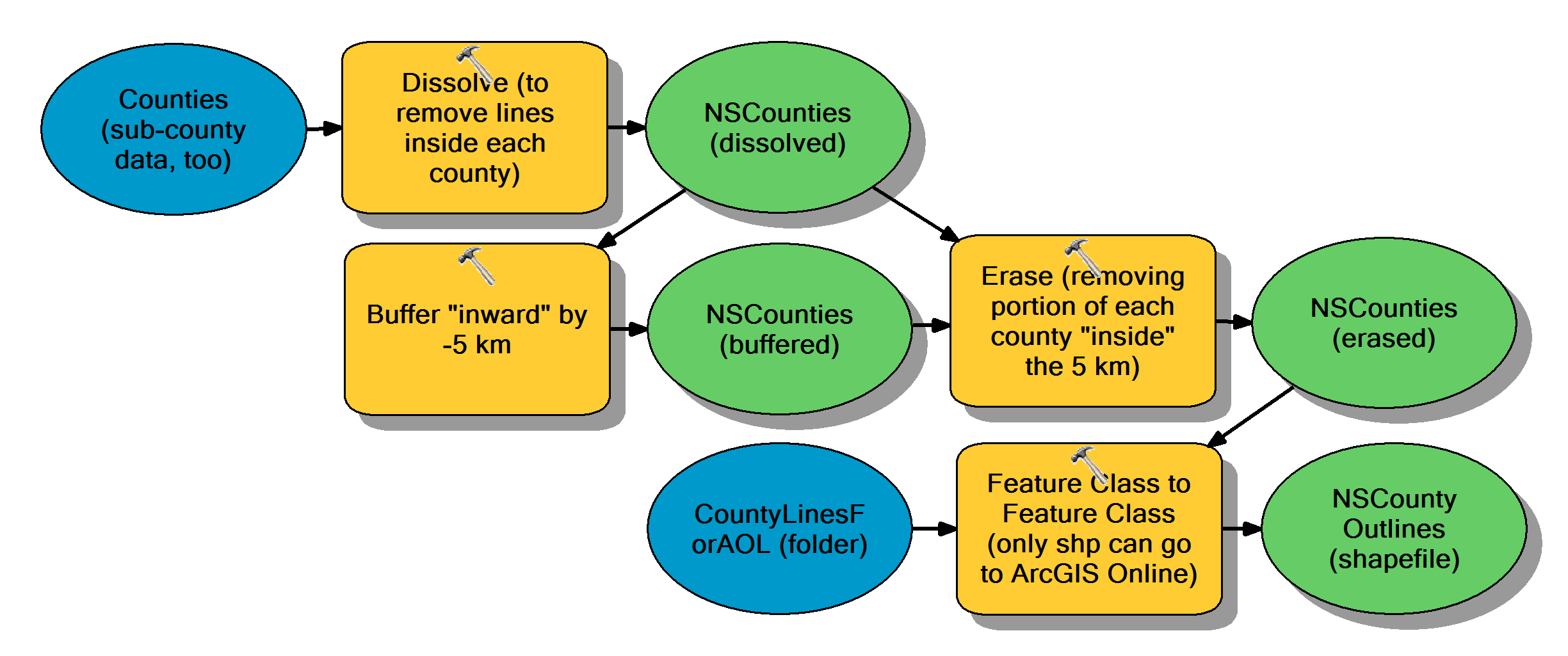 The ArcMap model (1) dissolves interior lines; (2) buffers inwards; (3) erases interior of each county; (4) converts to shapefile.