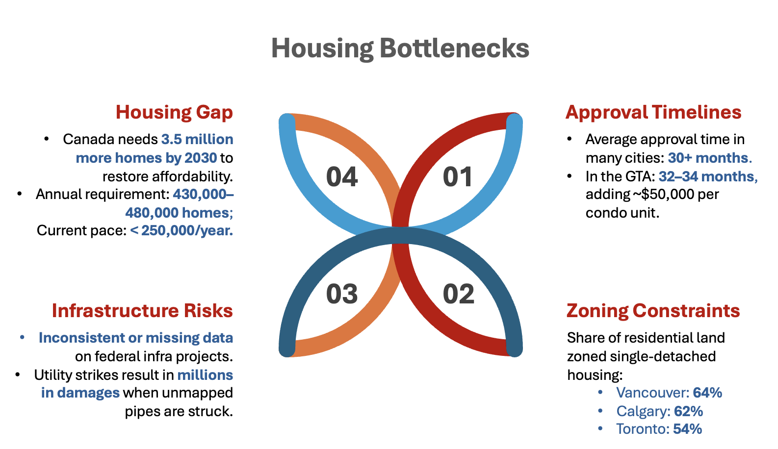 But ambition without execution won’t close the gap. CMHC’s 2025 analysis makes it plain: Canada must nearly double its housing output every year to restore affordability. That won’t happen if approvals take three years, zoning is locked in outdated maps, and infrastructure records are missing.