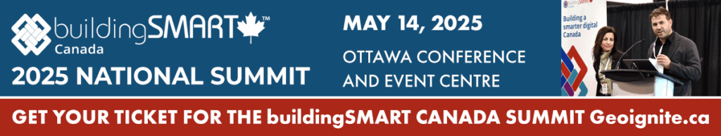 GeoIgnite 2025, Canada’s premier geospatial leadership conference, will be held from May 12-14, 2025, at the Ottawa Conference and Event Centre. As part of this year’s programme, GeoIgnite will feature a dedicated track in collaboration with buildingSMART Canada, titled “Empowering the Digital Workforce: Boosting Productivity with AI, OpenBIM, and Information Standards.”