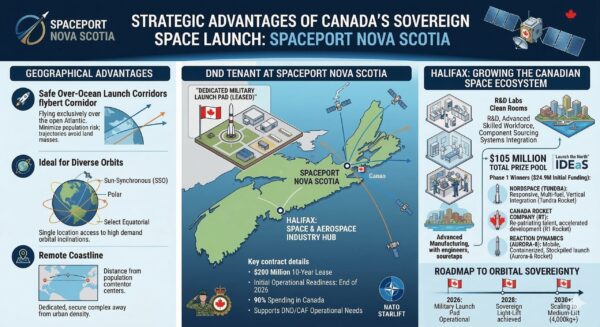The Department of National Defence is investing $200 million in a Nova Scotia spaceport, taking a key step towards a fully sovereign Canadian space sector. The spaceport will be in a highly-strategic location, with proximity to the Atlantic and access to ideal orbital inclinations.