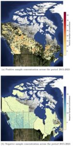 In contrast, Nunavut, Newfoundland and Labrador, and New Brunswick are less densely sampled due to a lack of fires during the analyzed period.