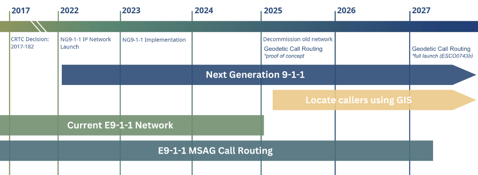The Canadian NG9-1-1 GIS Data Readiness Timeline outlines milestones that must be met by 2027. Municipalities must finalize geodetic routing and consolidate data from sources like road centrelines, address points, and PSAP/service boundaries — all validated to meet NENA standards.