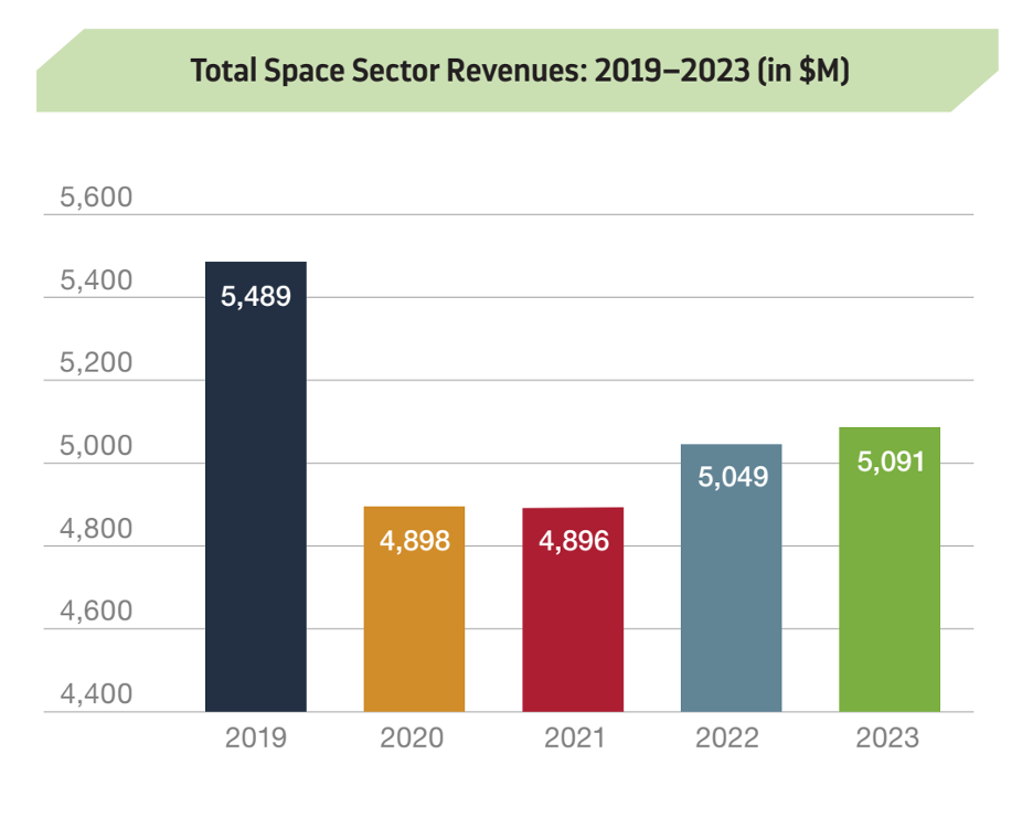 Export growth made up for a drop in domestic revenues, and the long decline of satellite broadcasting continued to drag on the numbers. Growth showed up elsewhere — navigation, Earth Observation, space exploration, and upstream manufacturing all moved in the right direction — but not yet at a scale that reshapes the overall revenue base.