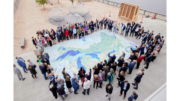 The Biinaagami Giant Floor Map, developed by Canadian Geographic, is an educational storytelling tool aimed at teaching people of all ages about the significance of water in the Great Lakes area.