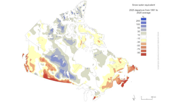 In 2025, many areas in the prairies and the Arctic had snow water equivalent levels above the average. Conversely, much of southern Canada, Baffin Island, the Pacific coast, and the Maritimes saw below-average snow water equivalent.
