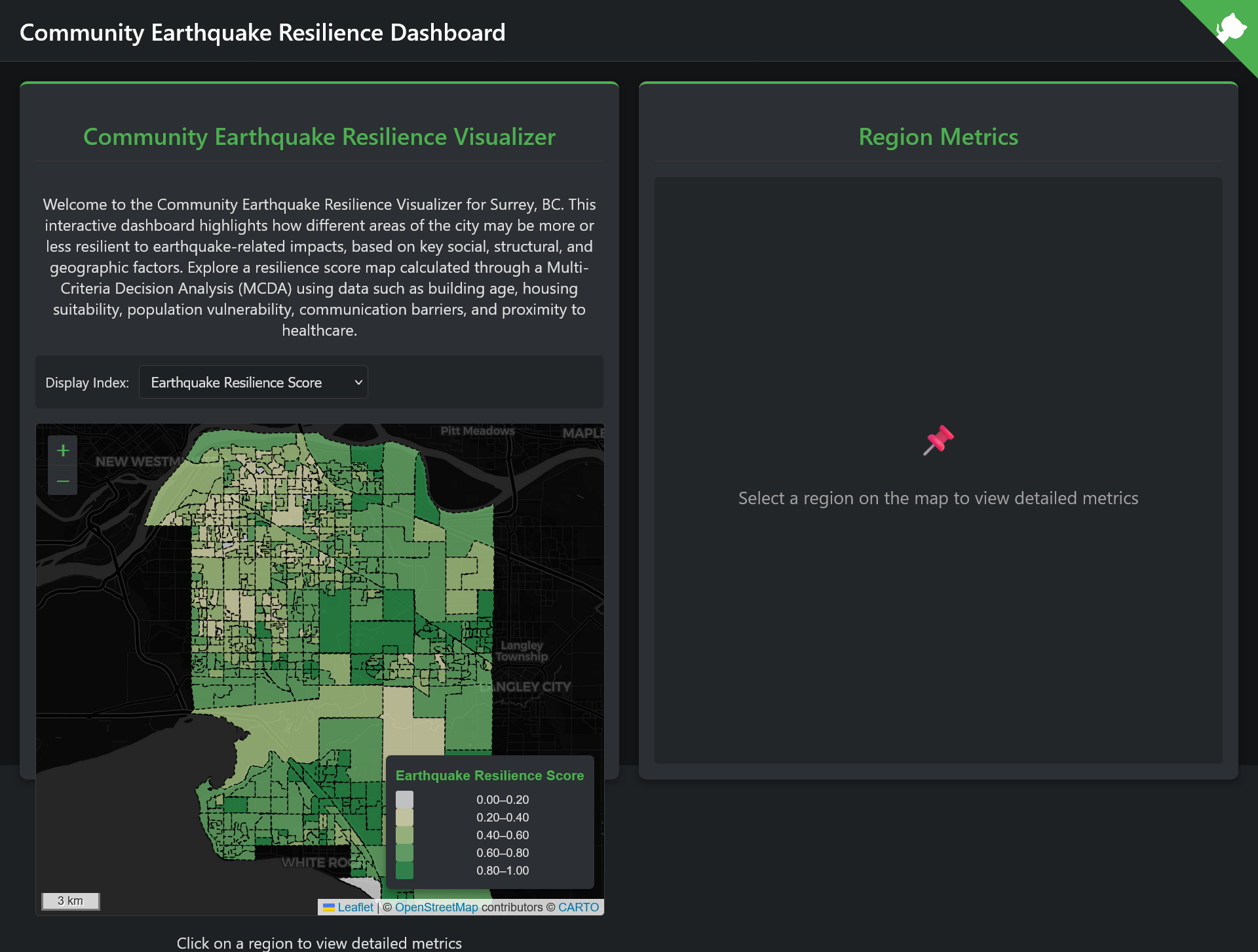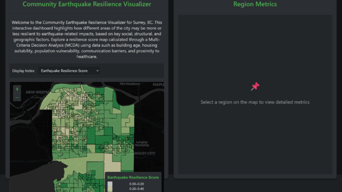 Pierre Koelich and Kyle Vu from the British Columbia Institute of Technology came in 1st place with their Community Earthquake Resilience Visualizer, which highlights earthquake vulnerability in Surrey, British Columbia. This application presents a variety of data, placing an emphasis on socioeconomic factors such as building history and population age. The application exists as a one page dashboard, making it easy for users to access the data.