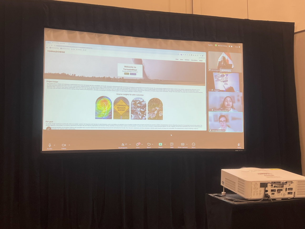 There were two groups that tied for 3rd place. Martha Paiz-Domingo and Malcolm Melbourne from Fanshawe College created an interactive tornado map titled TornadoWise. This application allows users to find information about tornadoes in Canada, including weather alerts and monitoring stations. An interesting feature of TornadoWise is that it provides separate information portals tailored to both residents and policy makers.