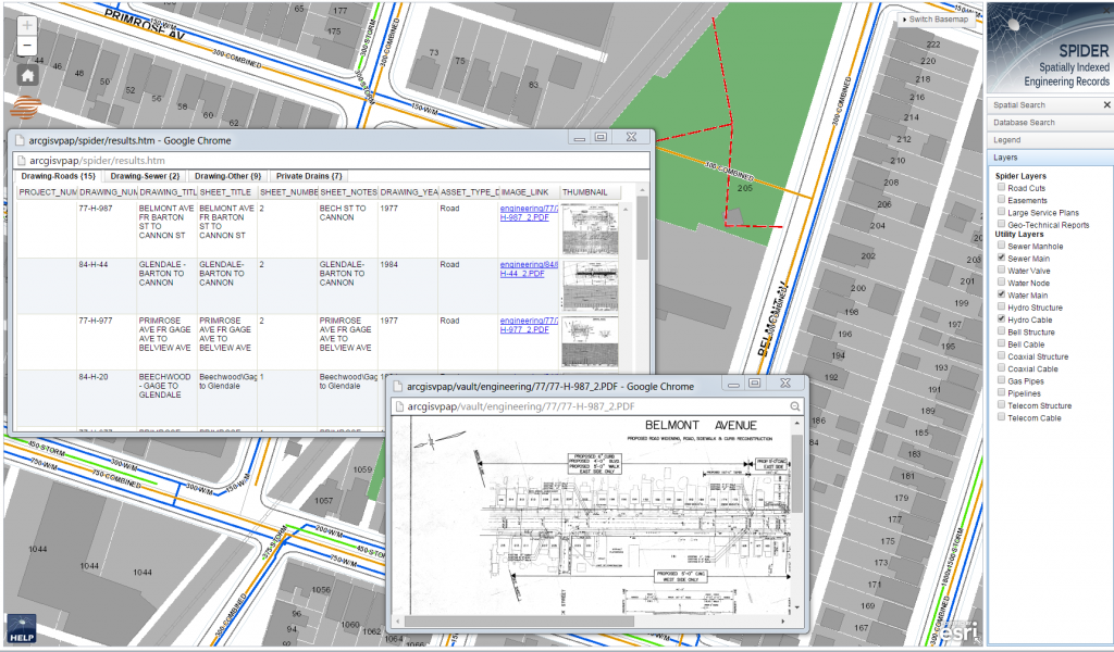 HAMILTON – April 30, 2015 – The City of Hamilton has launched a new online engineering records system that delivers significant efficiencies in locating information about the City’s public infrastructure. Called SPIDER (for Spatially Indexed Engineering Records), the system features an interactive Web map through which staff and partners can search more than 200,000 engineering records maintained by the City’s public works department. The City worked with Esri Canada to design and implement the system, which uses the latest Esri geographic information system (GIS) technology.