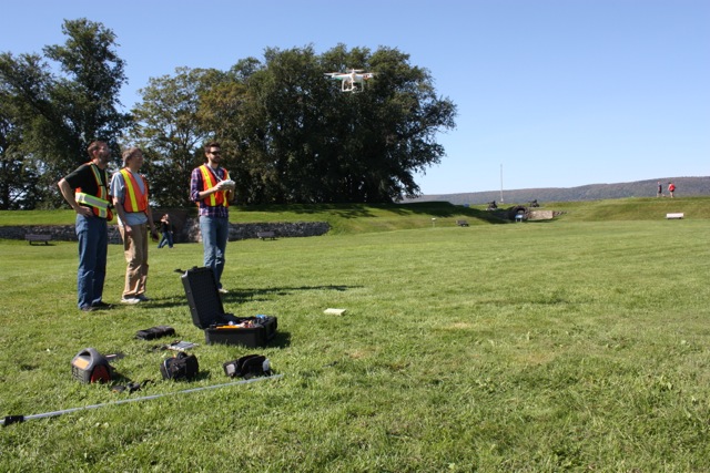 And so students Peter Willis and Garett Gaudet, under the guidance and tutelage of faculty Trevor Milne, Paul Illsley and Jim Norton, set to work to figure out just how they would accomplish the task. For the photogrammetric model, software such as Agisoft’s Photoscan will be used, as well as the open source platforms Python Photogrammetry Toolbox, developed by ATOR (Arc-Team Open Research), and MeshLab, a powerful 3D triangular mesh renderer. The photogrammetric research will consist of much trial and error, and thankfully, COGS is located within 30 minutes of Fort Anne, meaning field excursions can occur fairly regularly, and at minimal cost. Stage one of the process involves acquiring as many photographs as possible from a fixed lens at ground level, pole elevated (14 feet), and aerial using a Phantom DJI Quadcopter. Presently, our testing has indicated that the best time for taking photographs is at mid-day, under completely overcast conditions. These conditions serve to assist the software in determining identical points within the photos. Shadows and uneven lighting hinder this process greatly, making it nearly impossible to identify ‘like points’.