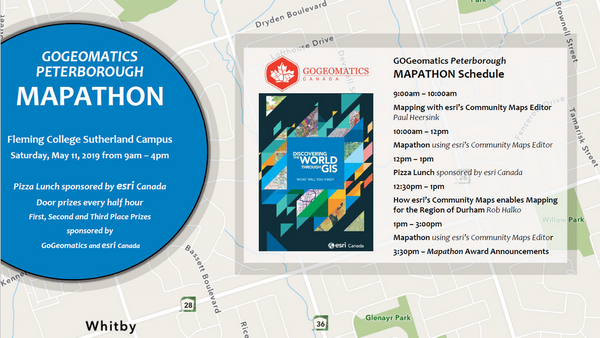 GoGeomatics Peterborough is hosting a Mapathon at Fleming College to create data for the Region of Durham using esri’s Community Maps Editor on Saturday, May 11, 2019 from 9am – 4pm. The event is sponsored by Fleming College, Esri Canada and GoGeomatics Canada. We will have a few presentations from esri’s Paul Heersink, former Fleming Grad and Cartographer and Production Manager of Esri Canada’s Community Maps and Rob Halko, former Fleming Grad and Supervisor of GIS for the Region of Durham. A pizza lunch will be provided, door prizes announced every half hour and awards will be given for volume of quality data created in the time allowed. We are excited about the event and hope that you will be able to join us May 11! Please RSVP so that we can finalize all of the event details.