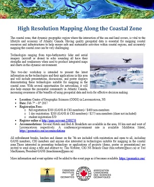 This two-day workshop is intended to present the latest information on the technologies and their applications in this area and will include presentations, discussions, and poster displays demonstrating these technologies suitable for mapping in the coastal zone. With several opportunities for networking, it will also help engage the geospatial community in Atlantic Canada, increasing awareness of the benefits of using geospatial data and tools for effective decision making.
