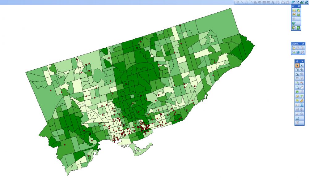 This is the first map I have students create when they start in GIS – I often also use it for visiting high school students. It lacks peripheral junk such as north arrow and scale bar – just the bare bones map. It shows income as the choropleth layer following the convention the-darker-the-greater. The points are the homes of shoplifters – all of them were caught at a single store downtown (just to the north of the islands). We discuss the patterns of the two variables individually, but of course the power of the geography and the GIS is to hypothesise about the spatial relationship between them.