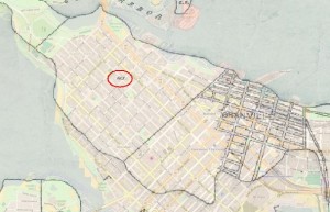 Now zoom in to the West End and note District Lot 185. This is the lot that was purchased by “The Three Greenhorns”, a derisive name given to three English settlers who purchased the 540 acres comprising DL 185 for $550.75, because its future value was not recognized at the time.