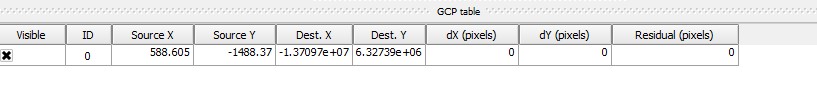 As well, the GCP table (Ground Control Points table) in the lower half of the Georeferencer tool records the point.