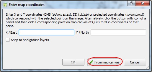 An “Enter map coordinates” dialog box (Figure 2) appears asking for the matching coordinates for this point on the map in the QGIS window. However it is not necessary to manually enter these, an easier alternative is to click the From map canvas button on the dialog box.