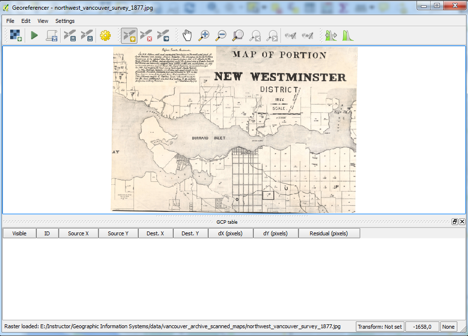 The Georeferencer dialog, shown in Figure 1, has two panes, one for the scanned map and one for the control points. Our example uses a scanned map downloaded (for free) from the City of Vancouver Archives entitled “Map of Portion New Westminster District 1877”.