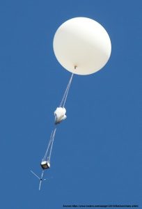 High altitude balloons typically collect weather data, such as temperature, wind speed, humidity, atmospheric pressure and changes in the environment. They do not require an engine or fuel and are filled with helium gas [10] [11], resembling blimps. They are tethered to a lightweight cardboard box called a radiosonde which contains scientific measuring instruments and a flight video [10] [11]. Balloons will lift to the edge of the stratosphere, rising higher as atmospheric pressure decreases, expanding the balloon until it pops. For instance, a 2 m diameter balloon will expand to 10 m and after surpassing its threshold, the radiosonde will parachute its way back to earth’s surface and the data is then recovered for further analysis [12]. Check out Figure 2 for what a weather balloon looks like.
