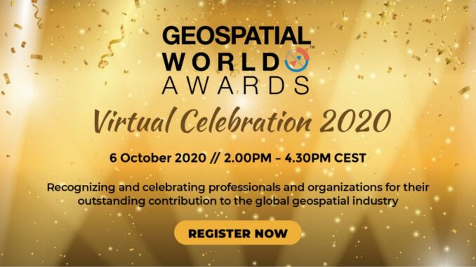 The Geospatial World Awards 2020 will be held virtually on 6 October 2020, from 2.00PM – 4.30PM CEST. Registration is now open at https://geospatialworldforum.org/virtual-awards/