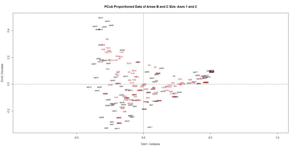 To dive deeper into the results, the second plot below portrays how the 92 excavation zones were formed at different stages in time that correlate with how the city developed and degressed. There were four formation processes found across the excavation zones where each represents how different forms of human activities led to the deposition of the pottery variables within the excavation zones. The statistical results from the PCoA and the different formation processes further represent when certain types of pottery types were in-use and then deposited for the last time before being excavated millennia later. From these relationships and correlations, trends and patterns are visible in both the quantitative and qualitative results.