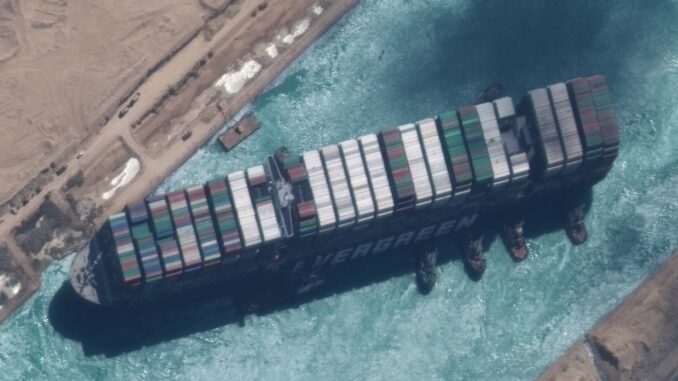 Feature Image: Maxar’s GeoEye 1 satellite of the Ever Given container ship in the Suez Canal at 11:52 a.m. on Monday, March 29, as crews freed the vessel after six days blocking the Suez Canal. Credit: Satellite image ©2021 Maxar Technologies