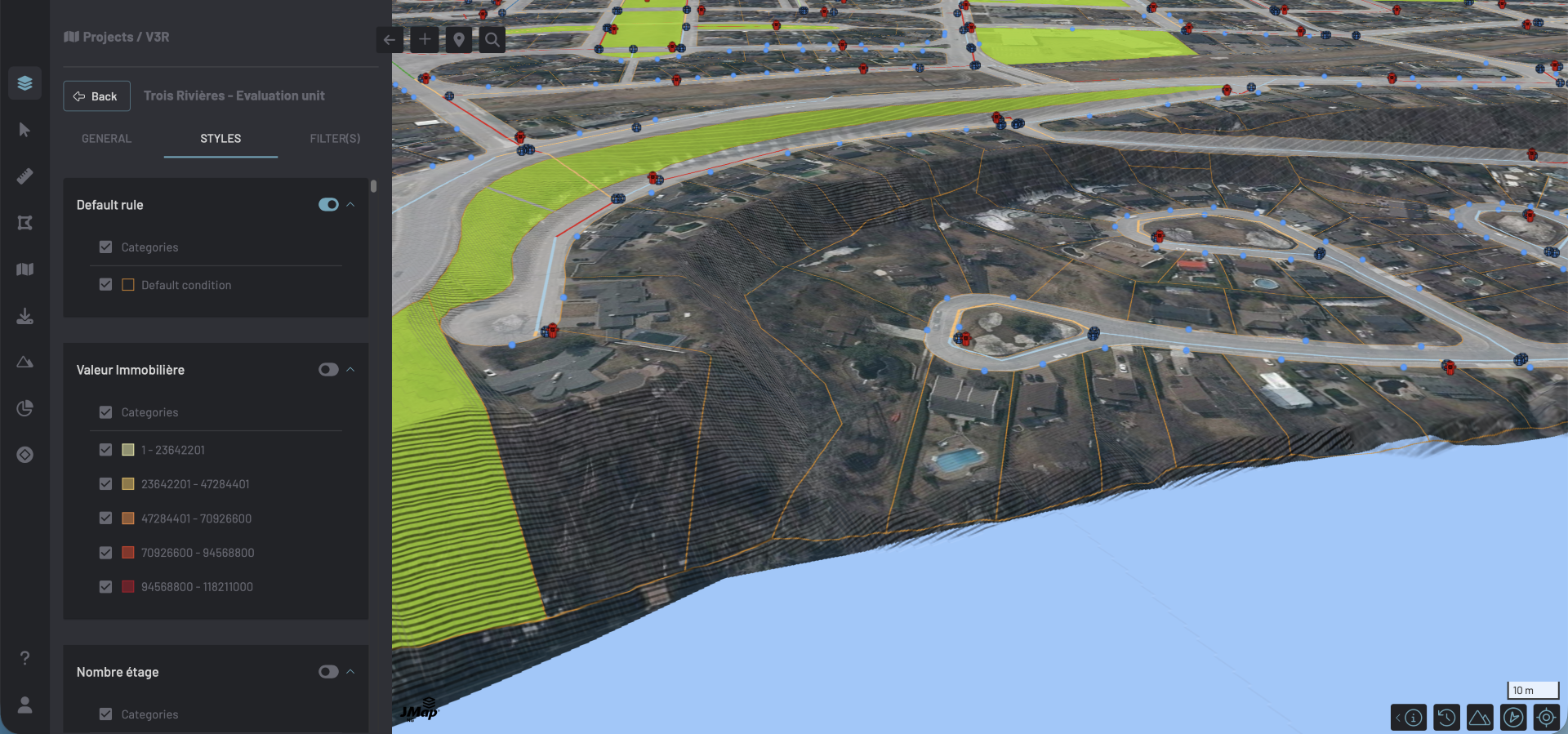 While JMap NG supports digital terrain models (DTM), they are not presently supported in JMap Studio. This means that the only method for adding a DTM to a project is by using the JMap Cloud API. If a user wants to view a DTM, or any other component of the project, they can alter the aerial view of the map by clicking and holding the right mouse button. This will allow users to see 3D view of the project.