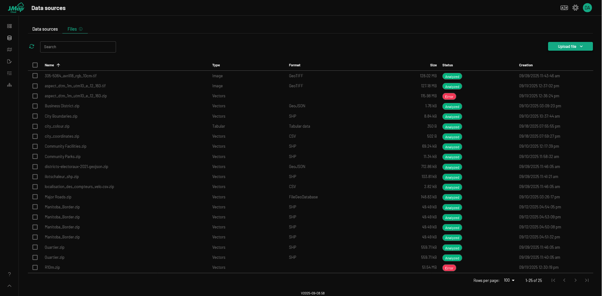 JMap Cloud supports a range of vector formats, including shapefiles and Esri Geodatabases. Data can be uploaded directly from the user or accessed from a web mapping or web mapping tile service. It is also possible to access data from a feature layer or vector tile service, although both functionalities have been temporarily disabled. JMap Cloud supports raster data in GeoTIFF format and tabular data in CSV format. When importing data, vector and tabular data must be zipped before upload, while raster data should be uploaded directly as a GeoTIFF file. If a user wants to create a raster mosaic, each individual raster should be uploaded separately to Files, before being used to create a single mosaic DS.