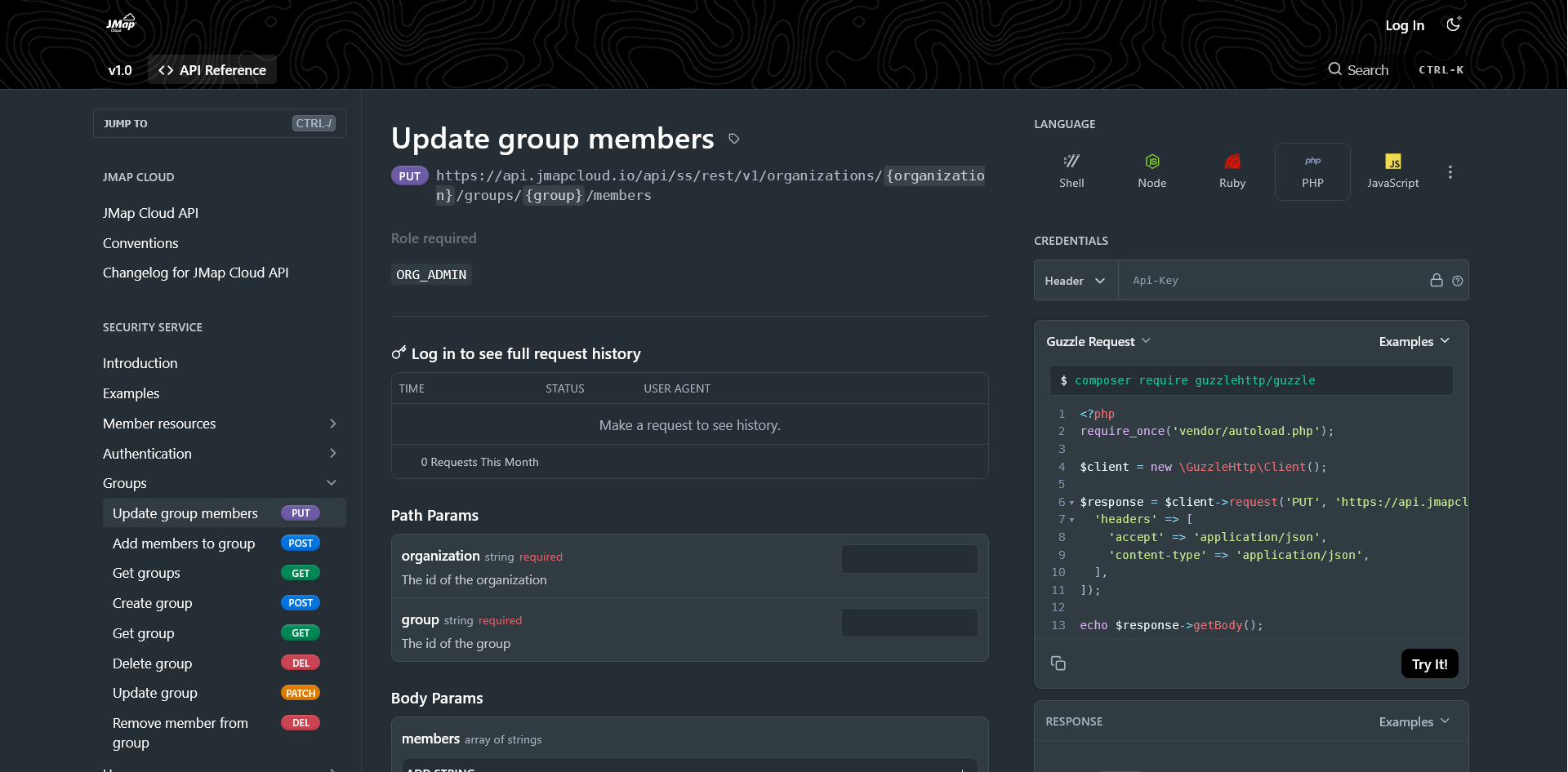 Alongside documentation for the JMap Cloud Platform, users will find documentation on the JMap Cloud API. This documentation outlines the many functions that can be performed with an API key, including functionality related to security, map configuration and data sources. For each available API call, users will find information about parameters, responses and – if they are signed into their JMap Cloud account – API request histories. There is a high level of interactivity in this documentation, allowing users to view and test API calls in different languages.