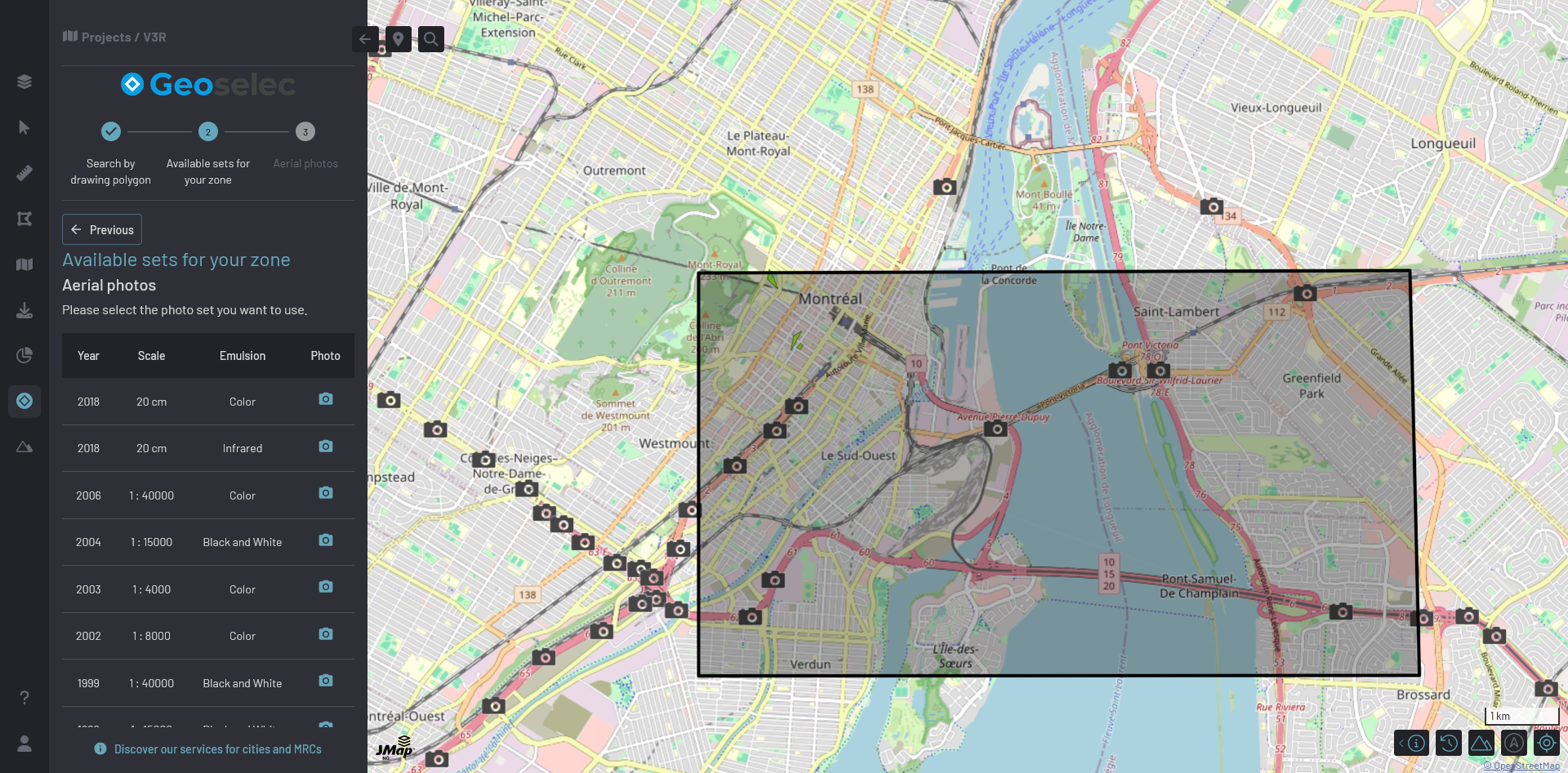 Within Organization, Administrators can enable extensions. Extensions are modules that can be added to a project, providing functionality from third parties in a similar manner to plugins in QGIS. Once an Administrator enables an extension, it can be used in any project within that organization. An example of an extension is Geoselec, which allows users to find historical aerial data for selected areas. After selecting an area on the map, the user will be shown Geoselec’s aerial imagery library, along with each image’s year, scale and emulsion.