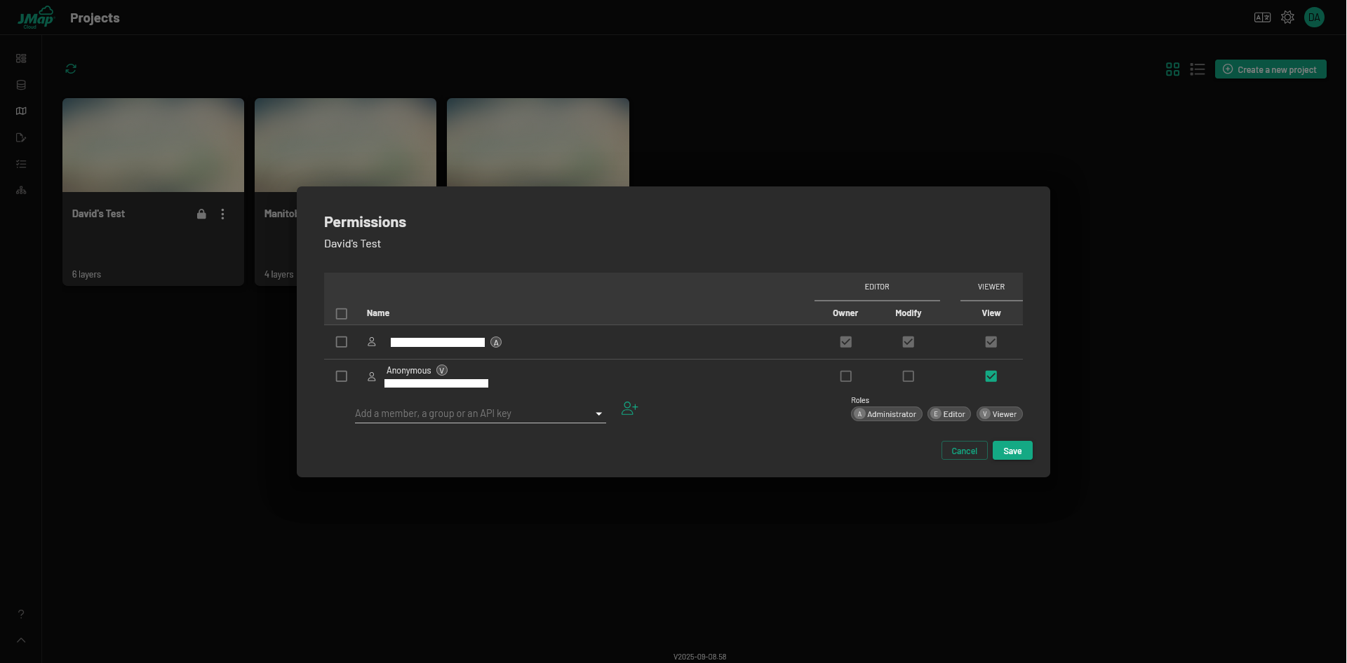 Map projects can be accessed through the Projects section. In order to interact with a project, a user must have the appropriate project-level permissions, which can be assigned based on a user’s organizational role. Users in the Viewer role can be granted permission to view selected projects, while users in the Editor or Administrator role can be granted permission to modify or own selected projects.