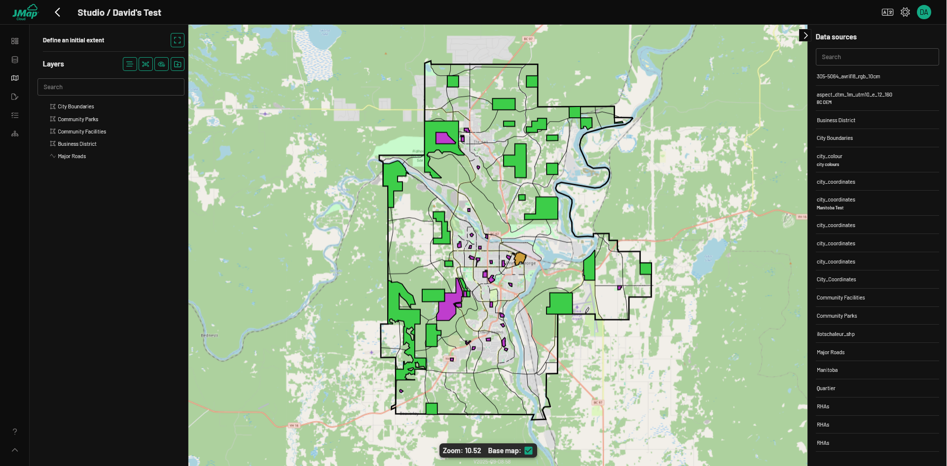 JMap Studio (shortened to Studio) is the JMap Cloud project editing interface. If a user has previously created DS, they can be found in the right panel. By dropping any DS onto the map, it will become a map layer. Information about map layers can be found in the left panel.