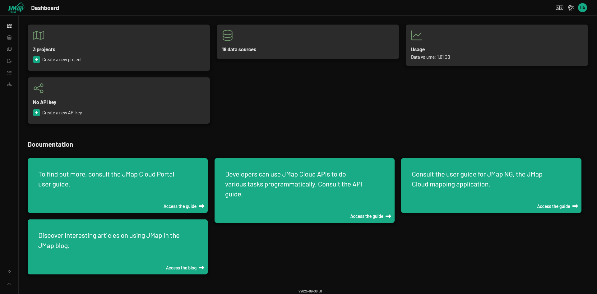 JMap Cloud comes with extensive, detailed documentation for both casual and advanced users of the platform. Documentation can be accessed via docs.jmapcloud.io, or through the links found at the bottom of the dashboard in JMap Cloud. Users will find information on the JMap Cloud platform, along with details about the JMap Cloud API.