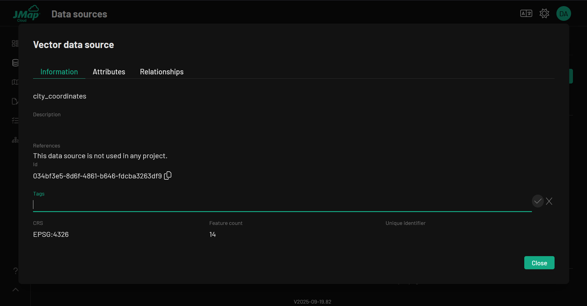 DS are permanent and can be used as layers or tables within any of the organization’s projects. DS can be created from data saved in Files, or uploaded directly from the user. Once a DS is created, users can change editing permissions or update data with a source from Files or through an upload from the user. If a user is working with vector data, it is possible to alter attributes and create relationships with non-spatial tabular data.