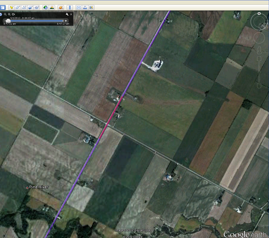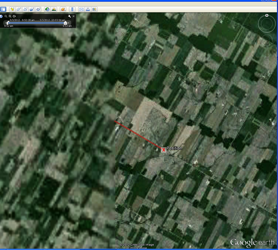 In the Google Earth GPS Import dialog box, I set the polling interval to 10 seconds and selected ‘Automatically follow the path’. This would allow for real-time tracking to occur. Every time the GPS recalculated my position, it zooms into your current position. This was extremely bothersome when trying to perform work in a different area compared to where the vehicle is located or when zooming out and panning around to other areas (Figure 2). The red line indicates the distance traveled during the predetermined polling interval of ten seconds. The red ‘x’ shows which direction I was traveling. You can see that I did not zoom in very far when setting the memory cache, thus a blurry yet doable map.