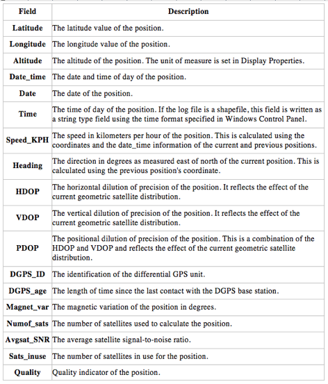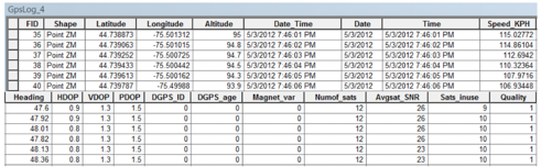 Table 1 illustrates the options available when using a GPS in ArcGIS10. As a line, you can only have the attributes selected at the start and end points of the line. If you choose to log as points, it will calculate all the data for the attribute table at every (I chose one-) second intervals (Table 2).
