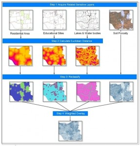 It was now time for the fun part. I began by using the Euclidean Distance Tool to convert the vector features into rasters, so that they could be used by the Weighted Overlay tool. Since some of the sensitive features had multiple setbacks, with varied associated weights, the next step was to use the Reclassify Tool to assign individual values to each feature and setback, in terms of importance. In order to perform arithmetic operations on rasters that originally held dissimilar values, ‘scale values’ were assigned to the features and their relative setbacks during this step, with a value from one to nine. The higher values represented areas with greater sensitivity towards landfill contamination.