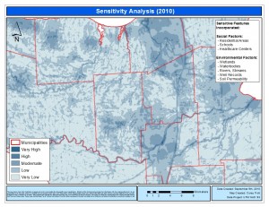 The final map, shown below, displays the varying level of sensitivity in the region pertaining to landfills. Darker areas on the map represent a location where a number of sensitive features have accumulated in close proximity, causing the area to be more sensitive. These areas have the potential to experience greater impact if contamination from a landfill occurred.