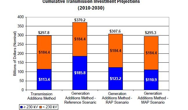 Estimates of the transmission buildout required in the US to reduce congestion and to bring renewable electric power to market have ranged from 19,000 to 50,000 miles of new transmission lines. The Brattle Group has estimated the total investment in transmission required between 2010 and 2030 to be on the order of $300 billion.