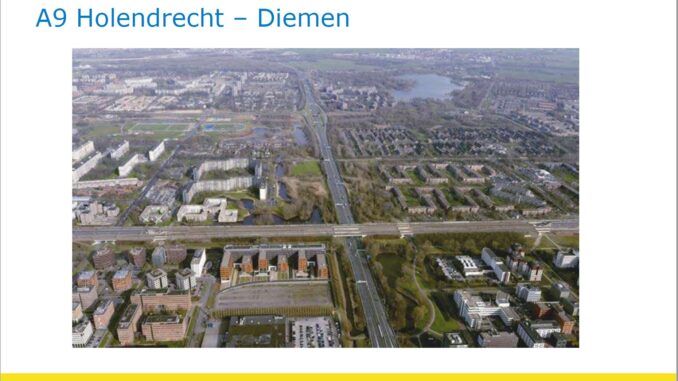 This includes the improvement of the natural and social environment and economic development and employment opportunities in the northern Randstad region. A stretch of the highway is shown before and after the highway widening.