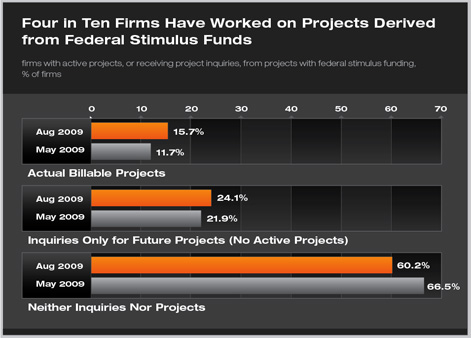 The American Institute of Architects (AIA) publishes a monthly assessment of the state of the economy in the architectural industry. For July they found that stimulus funds are reaching more architects now than earlier this year. 15% of their respondents reported that they have received actual billable work from the stimulus plan. In addition almost a quarter (24 %) received inquiries for future projects from stimulus funds. This is significantly higher than in May, when the comparable proportions were 11% and 22%, respectively.