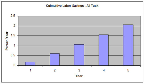 To do an ROI analysis for a typcal workflow, Marcia looked at basic workflows including data input, data management, data analysis, and publication of deliverables. She then aggregates the results and concludes that it is fairly easy to save a bit more than two person-years (3,800 hours) over a five-year period. Assuming an average labour average cost of $70 per hour, this means moving from AutoCAD to AutoCAD Map 3D can result in savings of $266,000 per seat over five years.