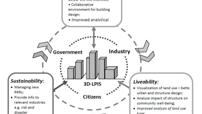Efficiencies in productivity would be gained from more holistic planning, incorporating social and economic aspects as well as improving transportation modes and improving land use and development. A 3D‐LPIS provides a platform to catalogue and connect ‘above the line’ with ‘below the line’ interests of a given property, resulting in improved analytical capabilities and potentially dramatically improving current regulatory processes.