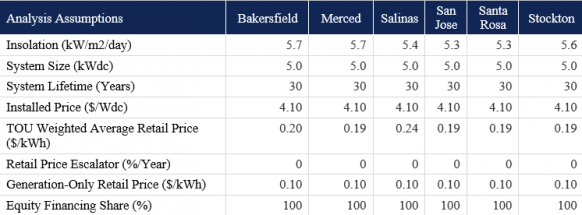 GTM Research has analyzed the impact of net energy metering on the annual electricity bill of PG&E customers with 5-kilowatt (kW) solar PV systems in Bakersfield, Merced, Salinas, San Jose, Santa Rosa and Stockton. They used real hourly energy consumption data from OpenEI and energy production data from PVWatts, as well as the actual PG&E tariff schedule for residential customers with retail time-of-use rates. They assumed that the cost of installation was $20,500 and that each installation had a lifetime of 30 years.
