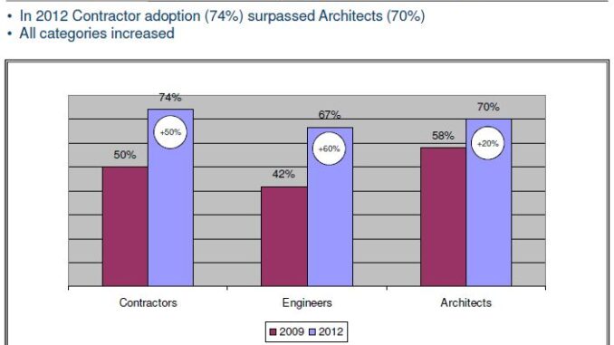 Overall Adoption of BIM has increased from 17% in 2007 to 71% in 2012, representing 45% growth over the last 3 years. In 2012 adoption by all categories of company increased, but contractors in particular saw increased adoption (74%) exceeding that of architects (70%).
